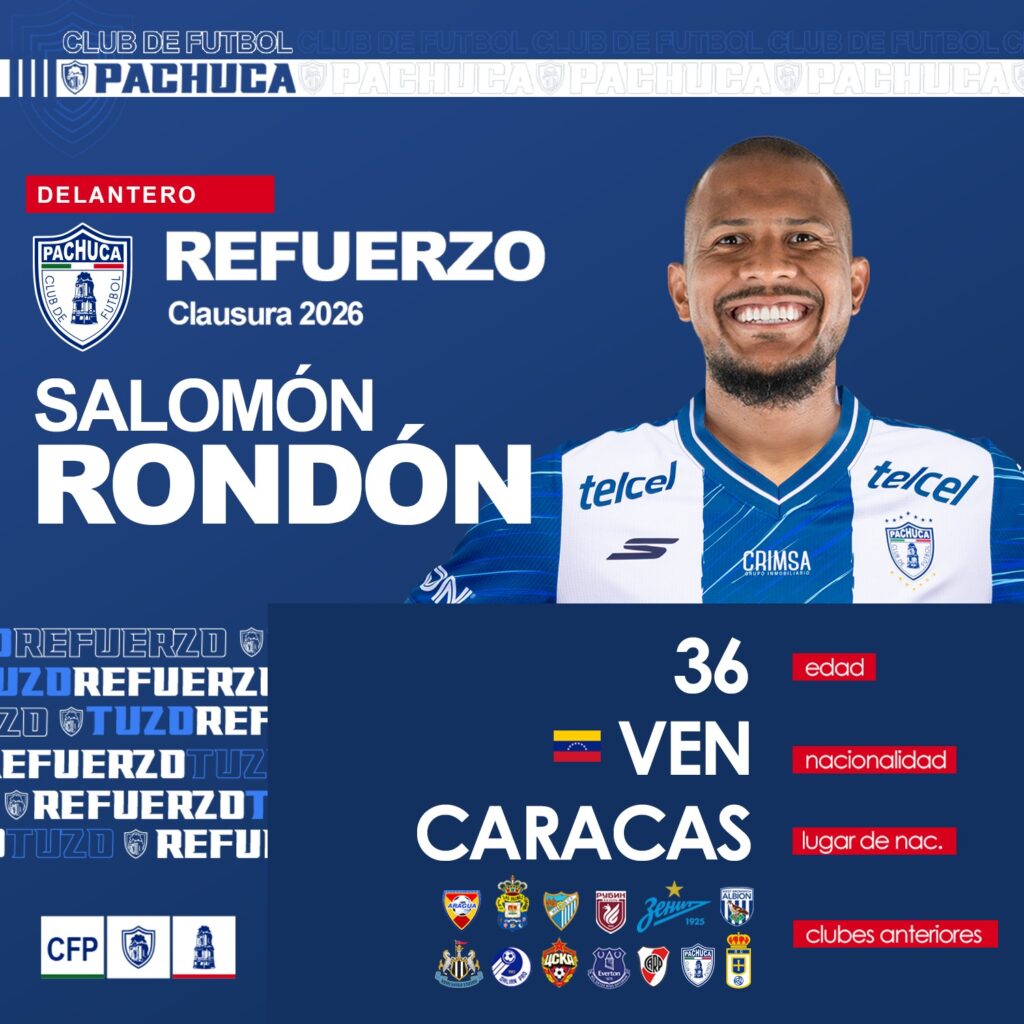 Los Tuzos del Pachuca hicieron oficial su primer fichaje para el Clausura 2026. Se trata del venezolano Salomón Rondón, quien regresa a los Tuzos luego de 6 meses cedido en el Real Oviedo de LaLiga. Con 36 años, el ‘Rey’ tendrá una nueva oportunidad en el equipo donde más goles ha marcado en su larga carrera.